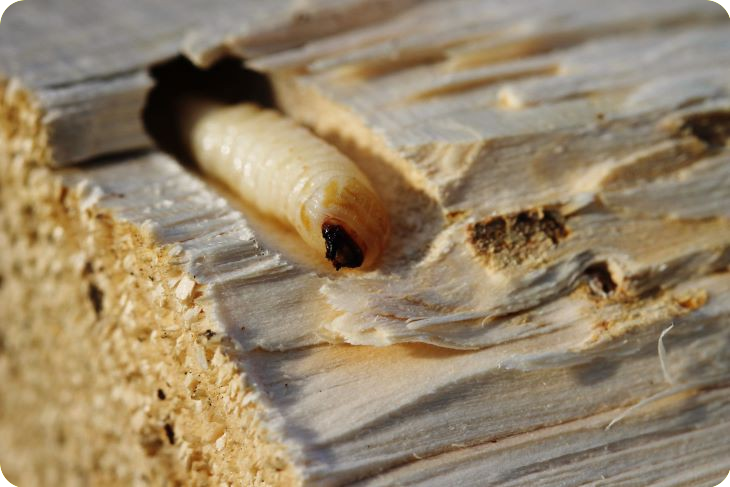 Houtworm tast hout aan. De larven vreten zich een weg door onbehandeld hout, van constructies en meubels. De larven ontstaan uit eitjes, die in het hout zijn gelegd door ‘mama’ kever. Ze heeft die eitjes bewust gelegd in hout dat haar ‘kindjes’ (de larven) heerlijk zullen vinden. De eitjes komen uit en de larven duiken direct dieper het hout in. Ze vreten zich een weg door het hout en maken lange, kronkelige gangen in. Dit vreetfestijn kan jaren duren.